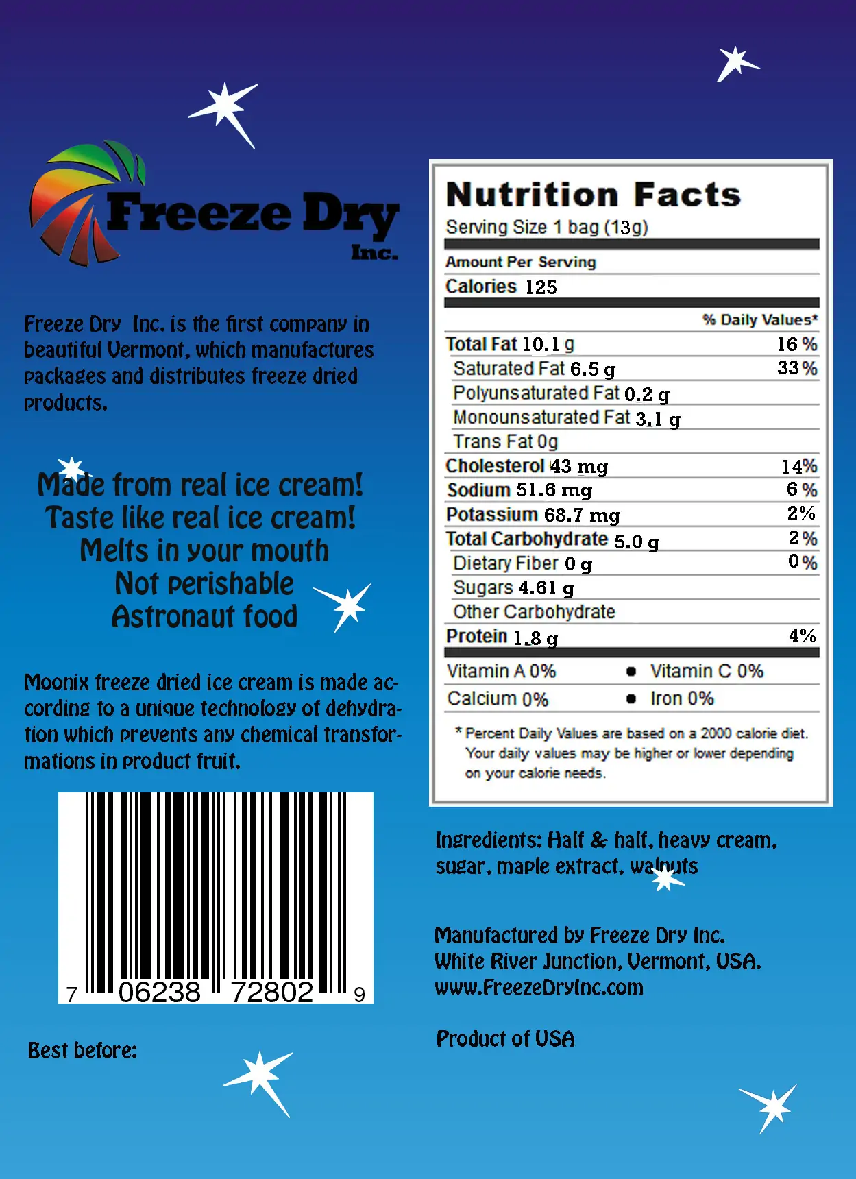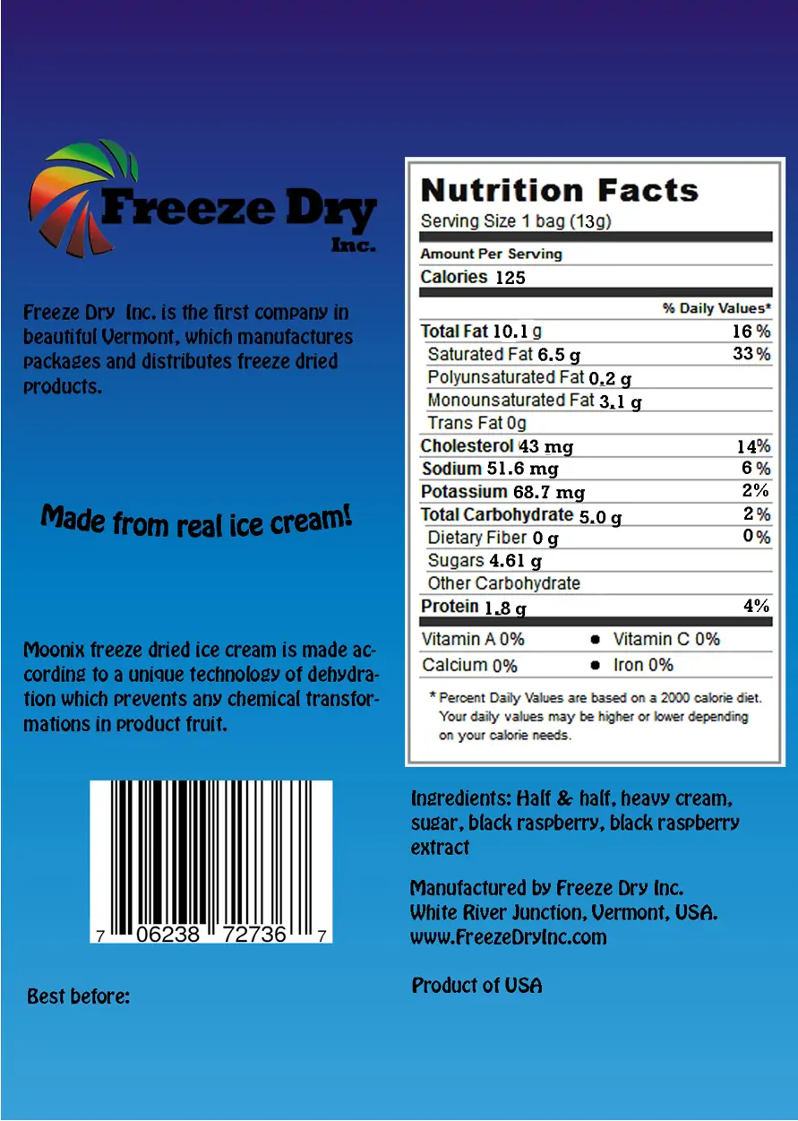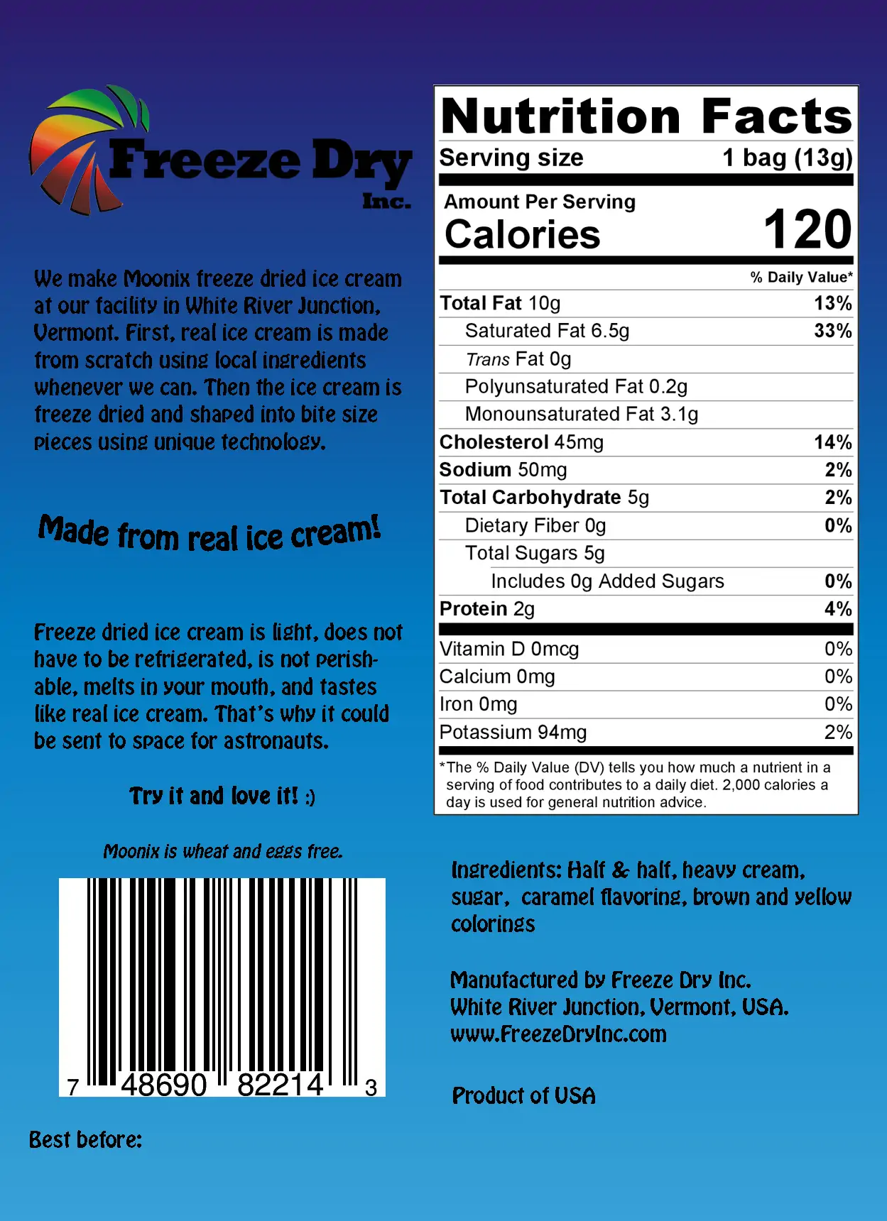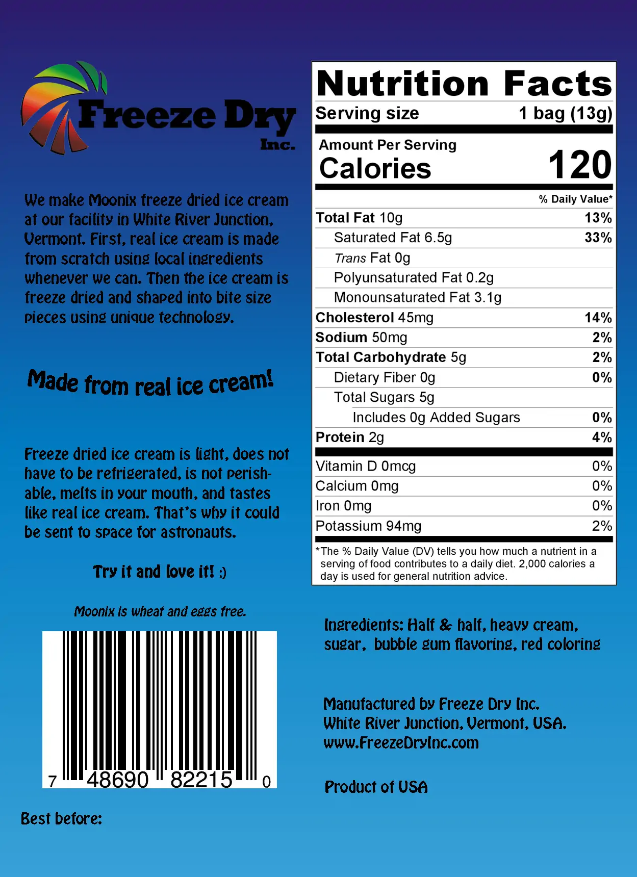 We make Moonix Freeze Dried Ice Cream at our facility by hand. First, real ice cream is made from scratch using local ingredients whenever we can. Then the ice cream is freeze dried and shaped into bite size pieces using unique technology. Freeze dried ice cream is light, does not have to be refrigerated, is not perishable, melts in your mouth, and tastes like real ice cream. That’s why it could be sent to space for astronauts. Try it and love it! Moonix is wheat and egg free and it is hand made from scratch. Expect taste and texture to be different from regular mass produced Astronaut Ice Cream. 100% Satisfaction guarantee. Love it or your money back!